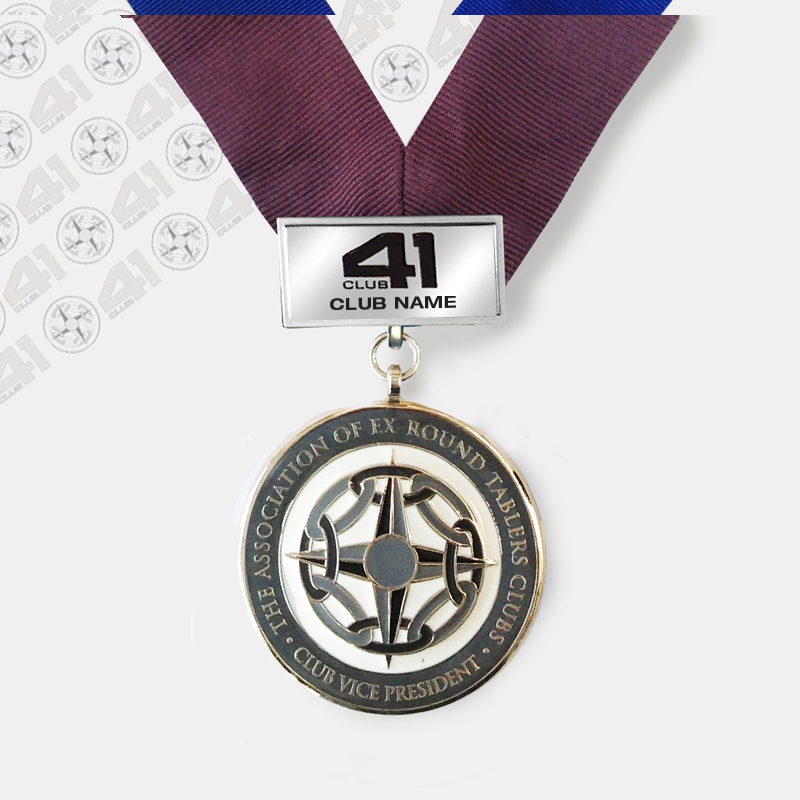 Club Vice President 50mm dia enamelled Jewel hanging from a 1 piece Burgundy Collarette with 40 x 20mm pinned brooch bar engraved and enamelled with Club name.