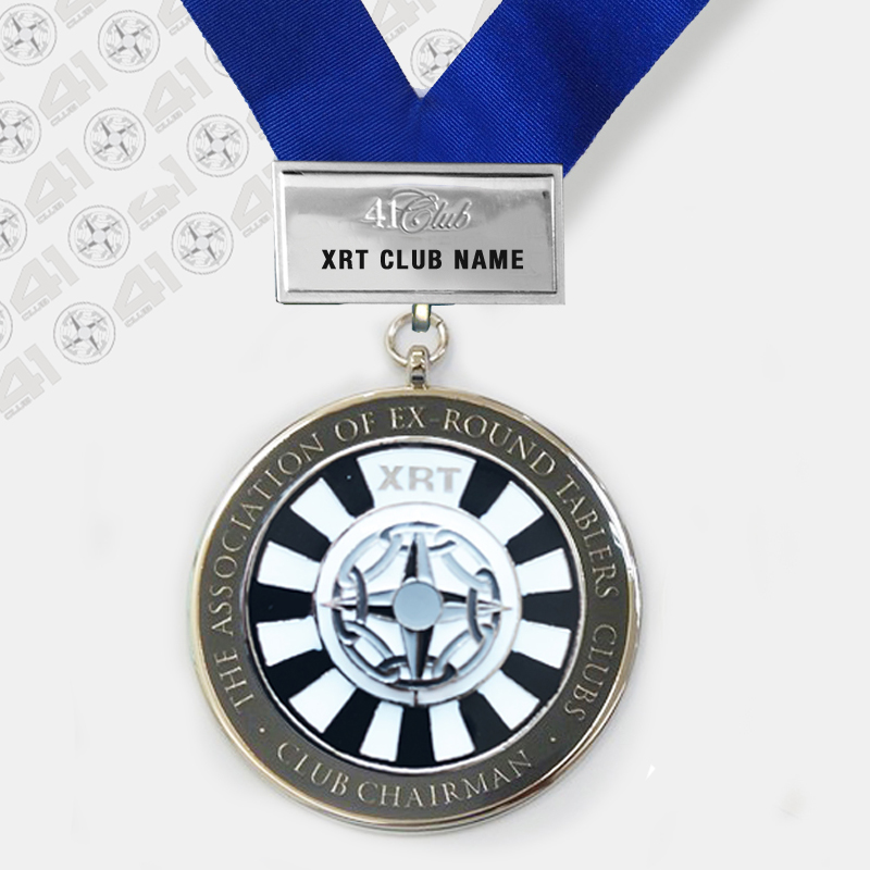 XRT Club Chairman 60mm dia enamelled Jewel hanging from a Blue Collarette with hook & eye and 40 x 20mm pinned brooch bar engraved and enamelled with XRT Club name. Packed in a Velvet drawstring bag for your storage & protection.